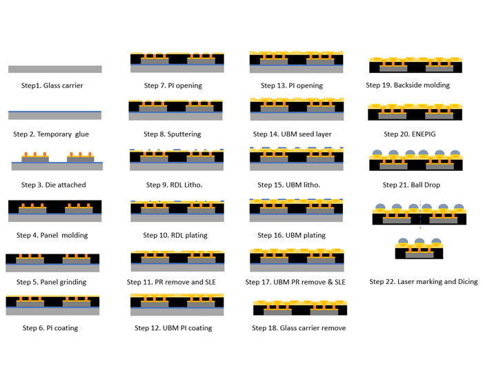 Advanced packaging technology plays an increasingly important role in the miniaturization of equipment, system integration and performance enhancement. Among many new packaging technologies, sector panel-level packaging (FOPLP) has attracted more interest and has shown the advantages of higher I/O count, integration flexibility, low cost, and small size due to the elimination of substrates . However, FOPLP using epoxy molding compound (EMC) materials faces many technical challenges, such as warping panel processing, difficulty in manufacturing fine-pitch redistribution layers (RDL), and large size due to CTE mismatch between chips and EMC Packaging reliability issues. In addition, for high-performance SIP, advanced FOPLP with multiple layers of fine pitch RDL is required, excellent alignment accuracy, the shortest interconnect wiring between dies, and ultra-small size.